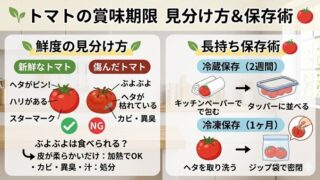 トマトの賞味期限や「ぶよぶよ」になった際の食べられる基準をプロが徹底解説!冷蔵・冷凍で2週間鮮度を保つ保存テクニックや、ミニトマト・カットトマト・ジュースの期限も網羅。腐った状態の見分け方を知って、無駄なく美味しく食べきりましょう。