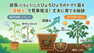 トマトの苗が徒長してひょろひょろに…とお悩みの方へ。諦めて捨てる前に「深植え」や「挿し木」の裏技で元気な苗に復活させましょう!発根を促すメネデール(活力剤)の効果的な使い方や、必要なプランターの深さまで、初心者向けにわかりやすく解説します。