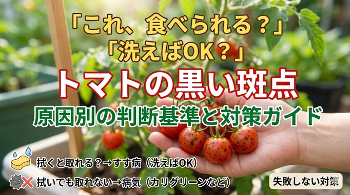 結論から言うと、トマトの黒い斑点は「原因」によって対処法がまったく異なります。 正しく見極めれば、美味しく食べることも、被害の拡大を防ぐことも十分に可能です。