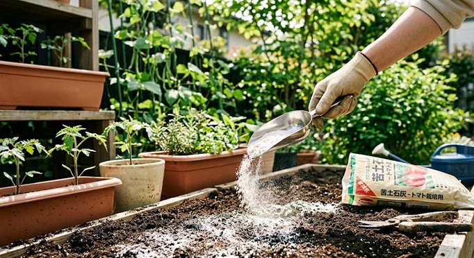 • 苦土石灰とは?:苦土(マグネシウム)と石灰(カルシウム)が混ざった肥料のこと。土の酸度(pH)を調整しながら、トマトに必要なミネラルを補給できる優れたアイテムです。