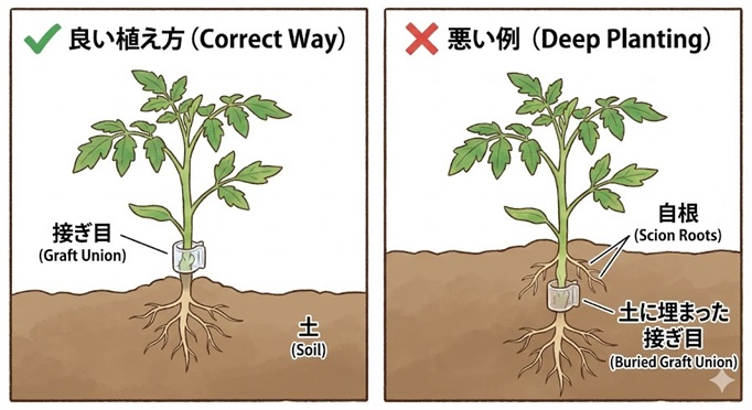 もし、この接ぎ目よりも深く植えて、上のトマトの茎(穂木)まで土に埋めてしまうと、どうなるでしょうか?