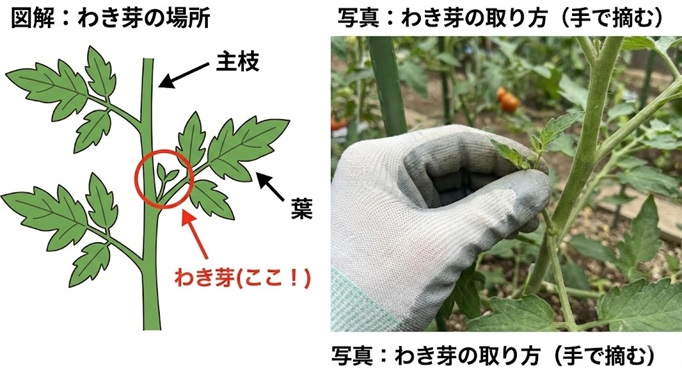 トマトが成長すると、茎と葉の付け根から新しい芽が出てきます。これを「わき芽」と言います。