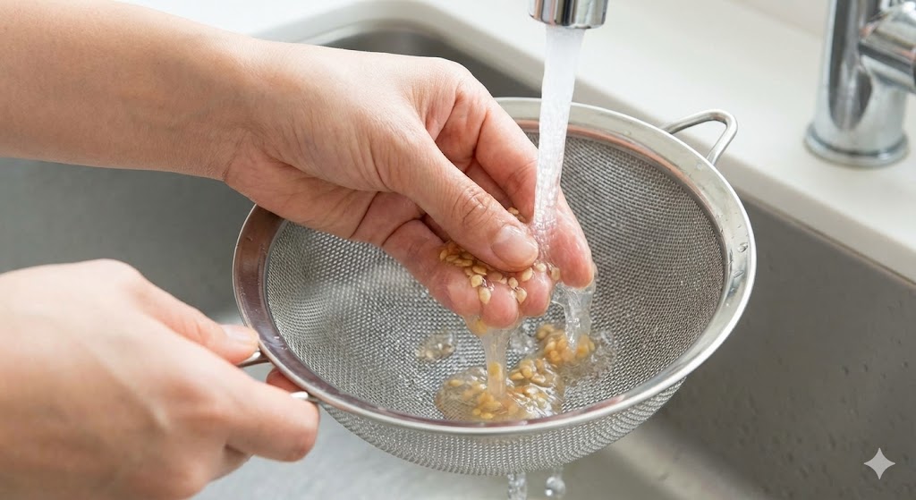 ※本格的にやる場合は、コップに種と水を入れて1〜2日常温で放置し、少し発酵させてから洗う方法もありますが、家庭用なら「ネットで揉み洗い」で十分綺麗になります。