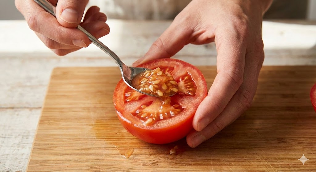 トマトを横半分に切り、スプーンなどで種の部分をゼリーごと掻き出します。