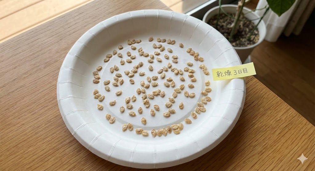 種同士が重ならないように広げ、風通しの良い日陰で3日〜1週間ほどしっかり乾燥させましょう。